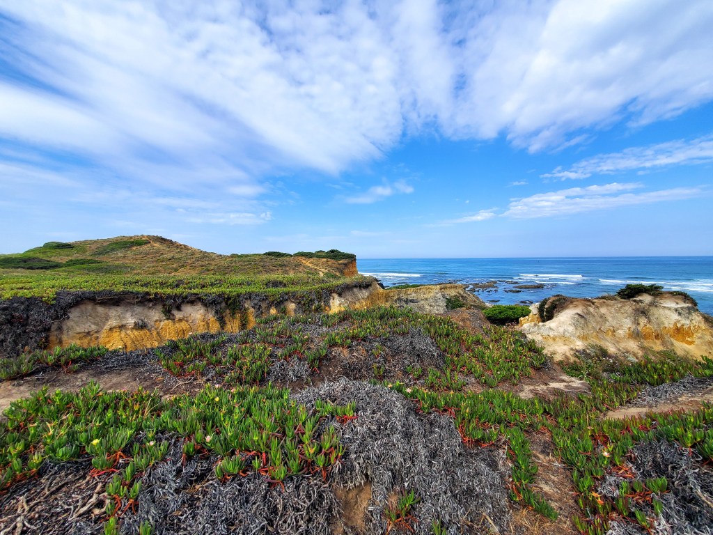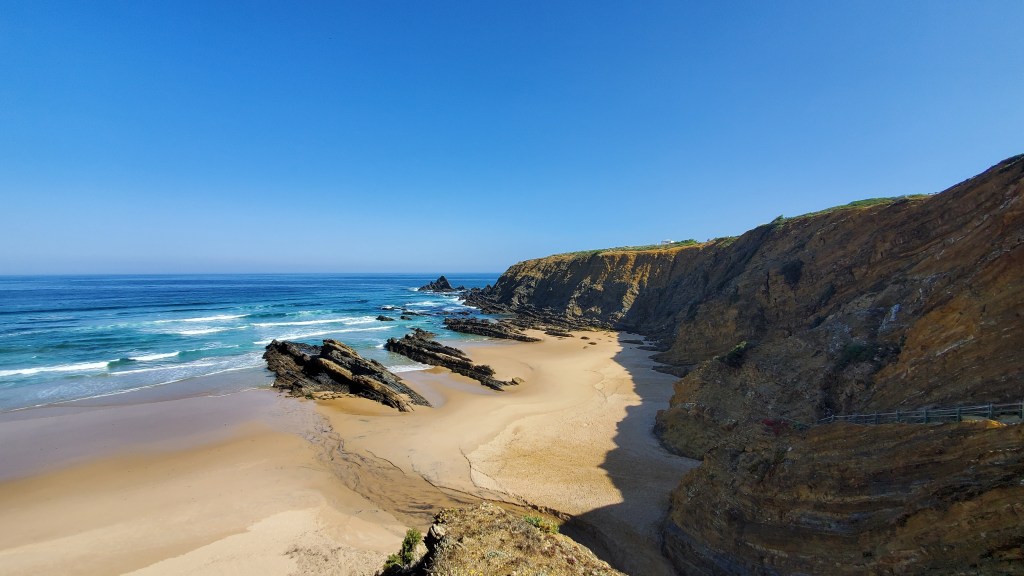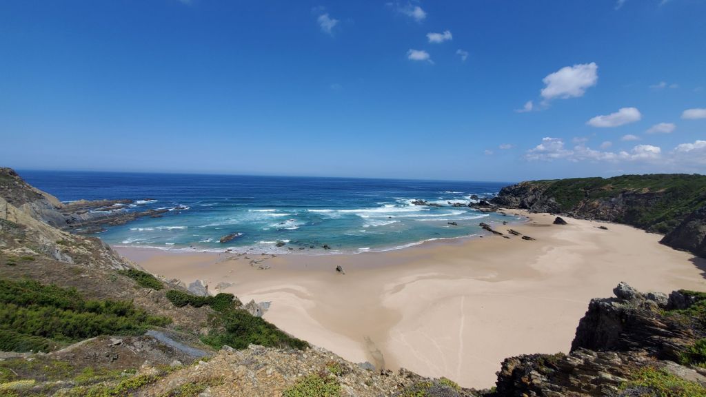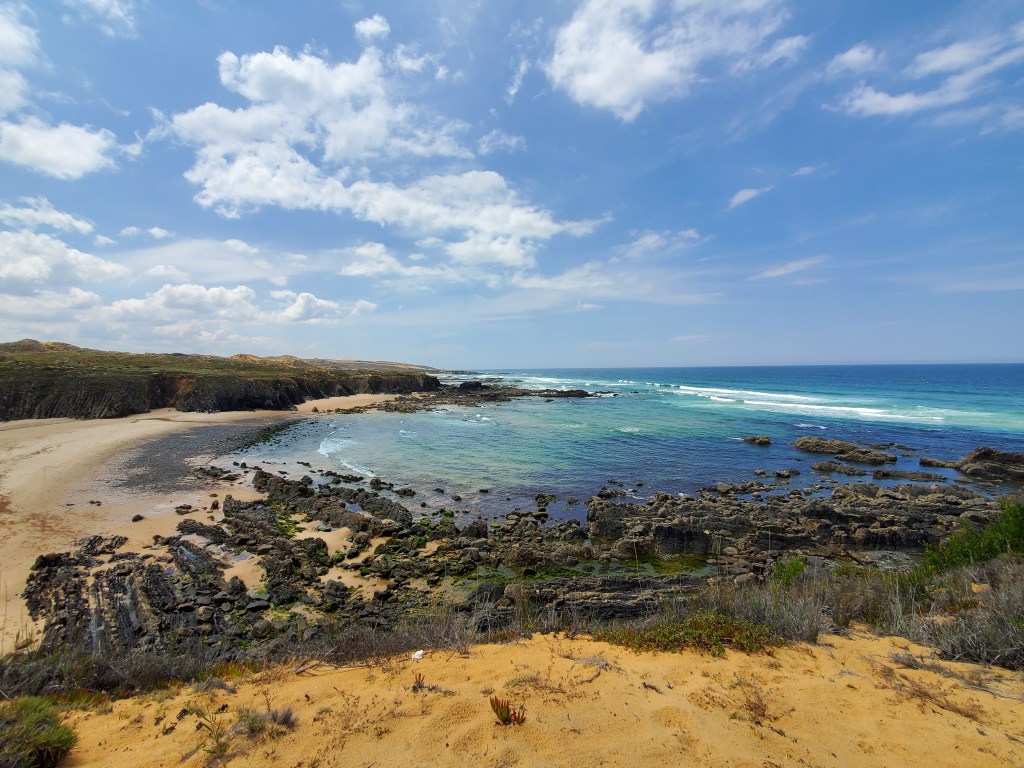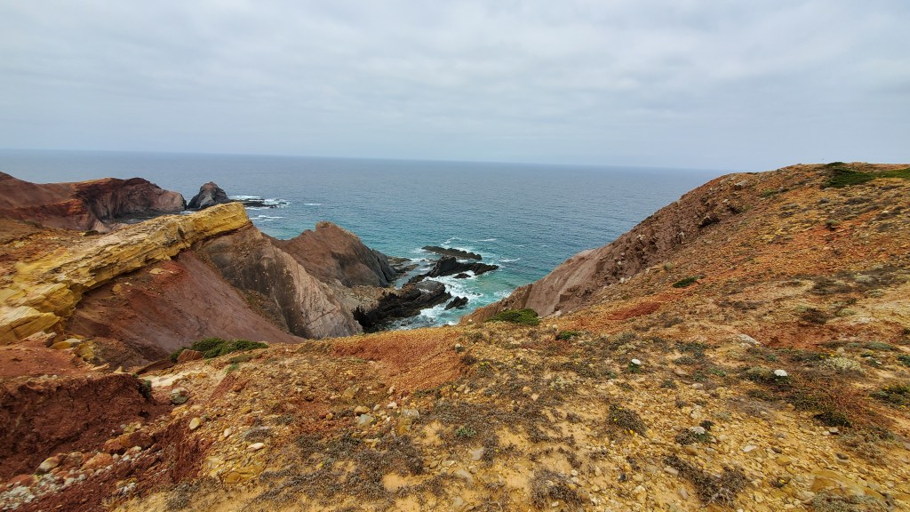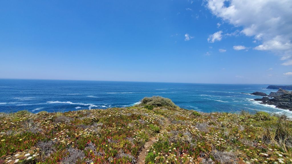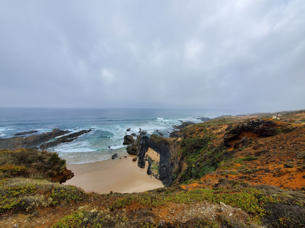 As I continued my journey – each day, with the slightest of variations in wide-eyed wonder moments, the same as the day before – I thought often of the old man and his fanciful tale, perhaps he wasn’t some unhinged flotsam. How else to make sense of this wild and remote and largely deserted corner of Portugal? That something cataclysmic had happened once upon a time when the world was new and things and places had no names was obvious, but a war between Gods and sea monsters? Whatever it was left behind something almost ethereal in its wake – there are no outside noises here to disturb one’s solitude, not even on overhead aircraft, just the wind careening into cliffs, the cry of seabirds aloft on thermals, and the booming crash of the Atlantic on craggy shores. It’s the sameness of it all that is the wonder. There are endless empty beaches, endless sheltered coves and more empty beaches, endless skies, endless moorlands of wildflowers, and the endless blue of the Atlantic. This is a land where adjectives flail, superlatives are enfeebled, and hyperbole just about captures its essence – there are no roads, no mobile service, and very few fellow travellers on the trails, just the sky, the sea, and the wind. Around every corner awaits another vista that stuns the senses. It is as if competing Gods had played one-upmanship before time began, each adding artistic flourishes of transcendent grandeur, a masterpiece around each corner. And the best part – I am mostly alone here, alone to feel the smallness of my existence, alone and lost in the wonder of it all. Who could have expected this on a journey to the end of the world?